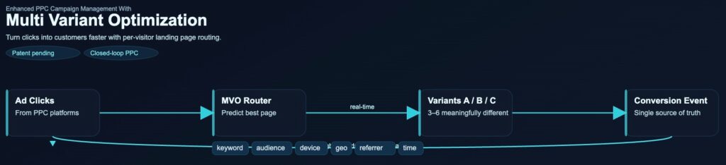 Multi variant optimization for PPC is adaptive landing page routing tied to your campaigns and powered by our proprietary, patent pending models and router. Instead of sending every click to one page, the system predicts which variant will convert for that visitor and serves it instantly. It continues to learn as volume, intent, and seasonality shift.